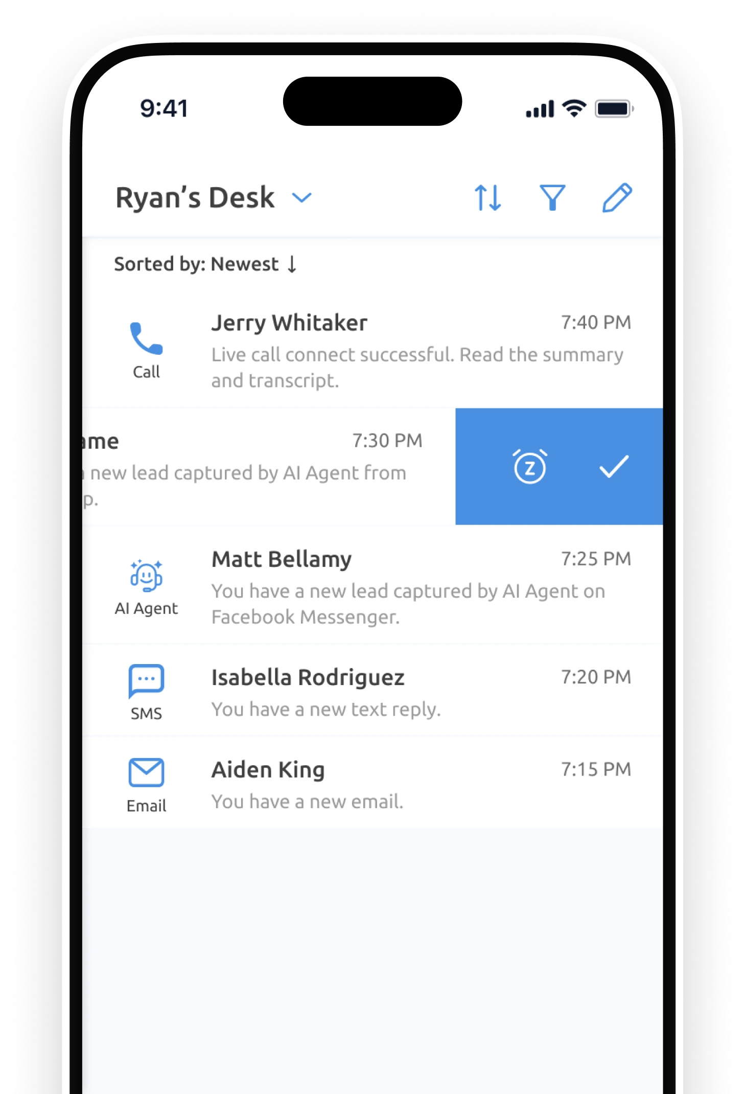 Track, manage, and follow up with every lead from one platform. Unify chat, text, and call activity into a single, actionable workspace.